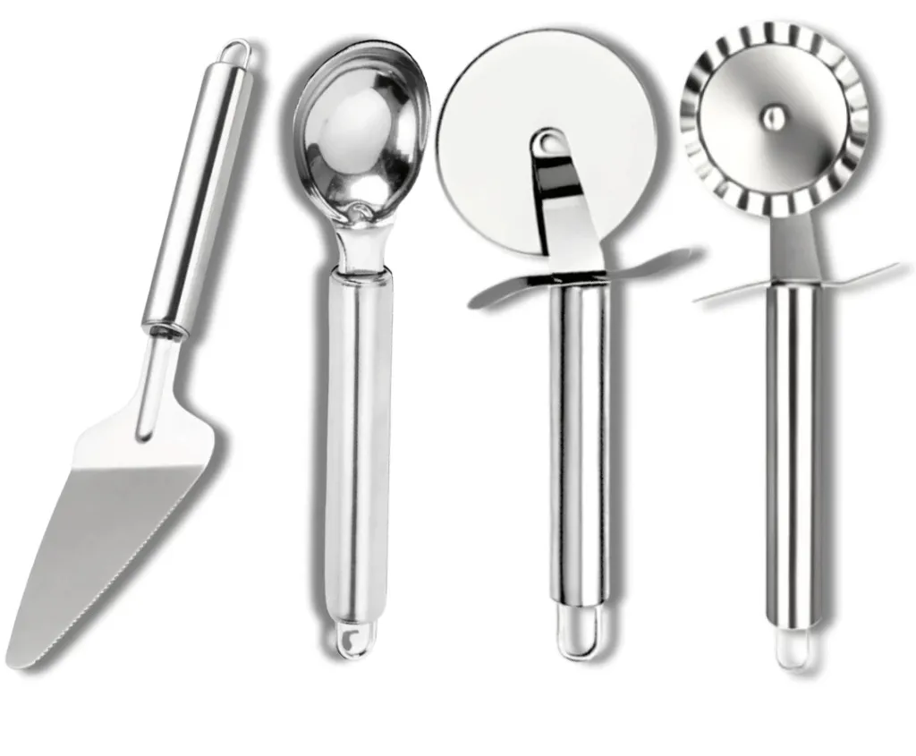 O Kit 4 Peças Inox reúne utensílios indispensáveis para o dia a dia: cortador de pizza, carretilha para massa, colher de sorvete e espátula de bolo. Fabricados em aço inox de alta qualidade, os itens são resistentes, fáceis de limpar e garantem durabilidade, além de um visual moderno para a cozinha. Versáteis, podem ser usados tanto em casa quanto em ambientes profissionais, como pizzarias, padarias e confeitarias. Leves e práticos, tornam o preparo e o serviço de diferentes receitas muito mais simples e eficiente, unindo funcionalidade e estilo em um único conjunto.